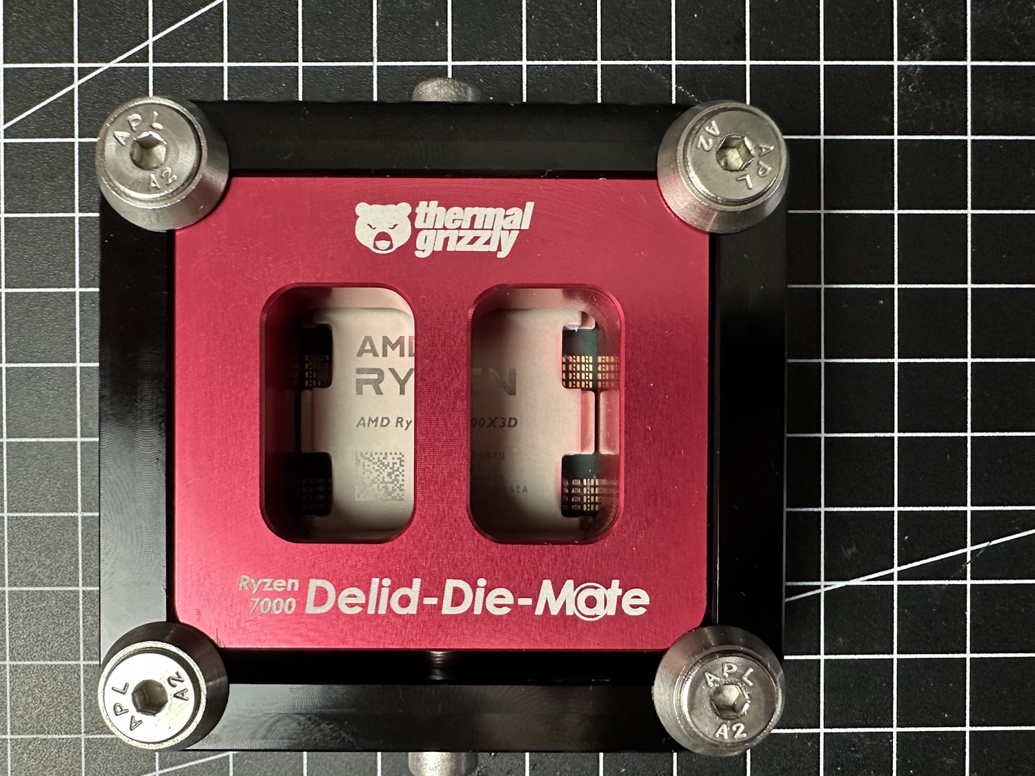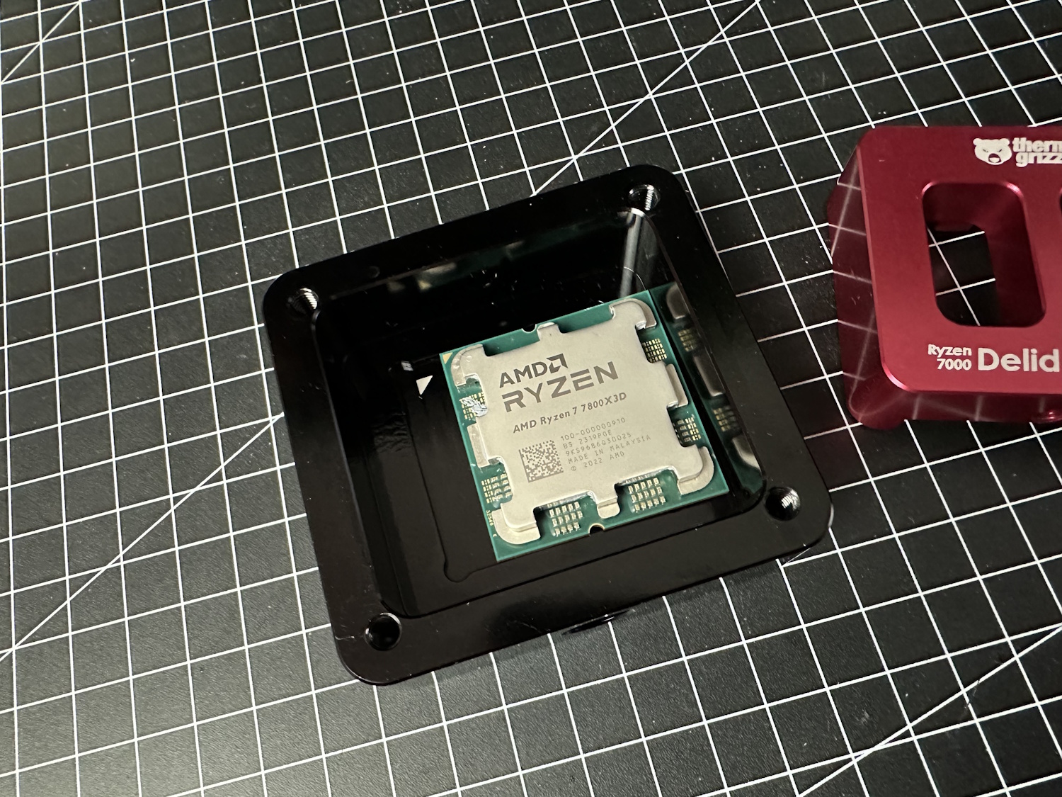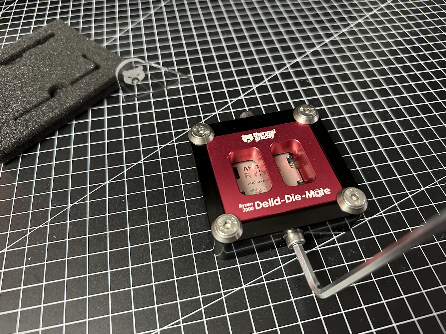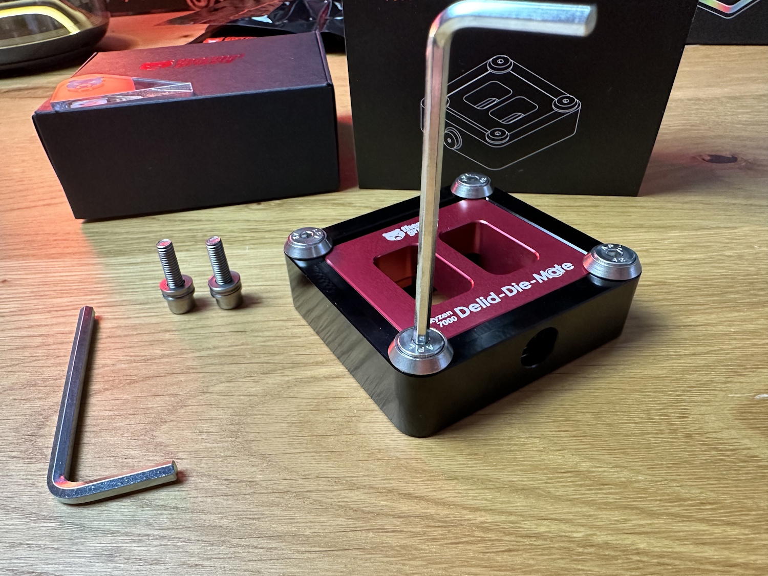Zuerst alle Schrauben aus dem Delid Die Mate entfernen und den roten Schieber entfernen. Jetzt wird die CPU, dreiecks-Markierung auf Dreieck, in das schwarze Gehäuse eingelegt. Die Platine der CPU wird dabei ohne viel Spiel aufgenommen und quasi formschlüssig festgehalten. Roten Schieber wieder auflegen, er passt nur in einer Position und alle Schrauben wieder montieren. Vier Schrauben auf der Oberseite sorgen zusammen mit Unterlegscheiben, dass der Schieber immer unten gehalten wird.