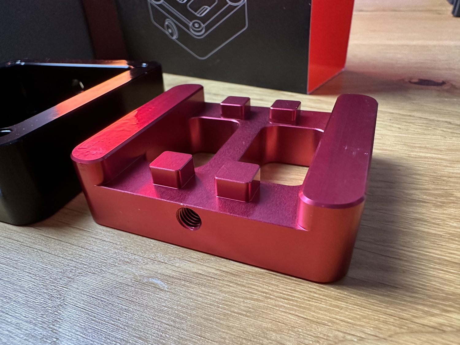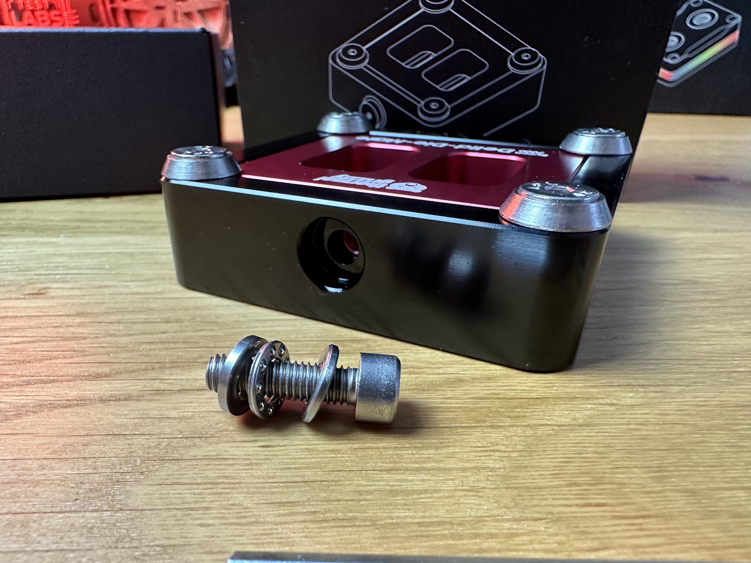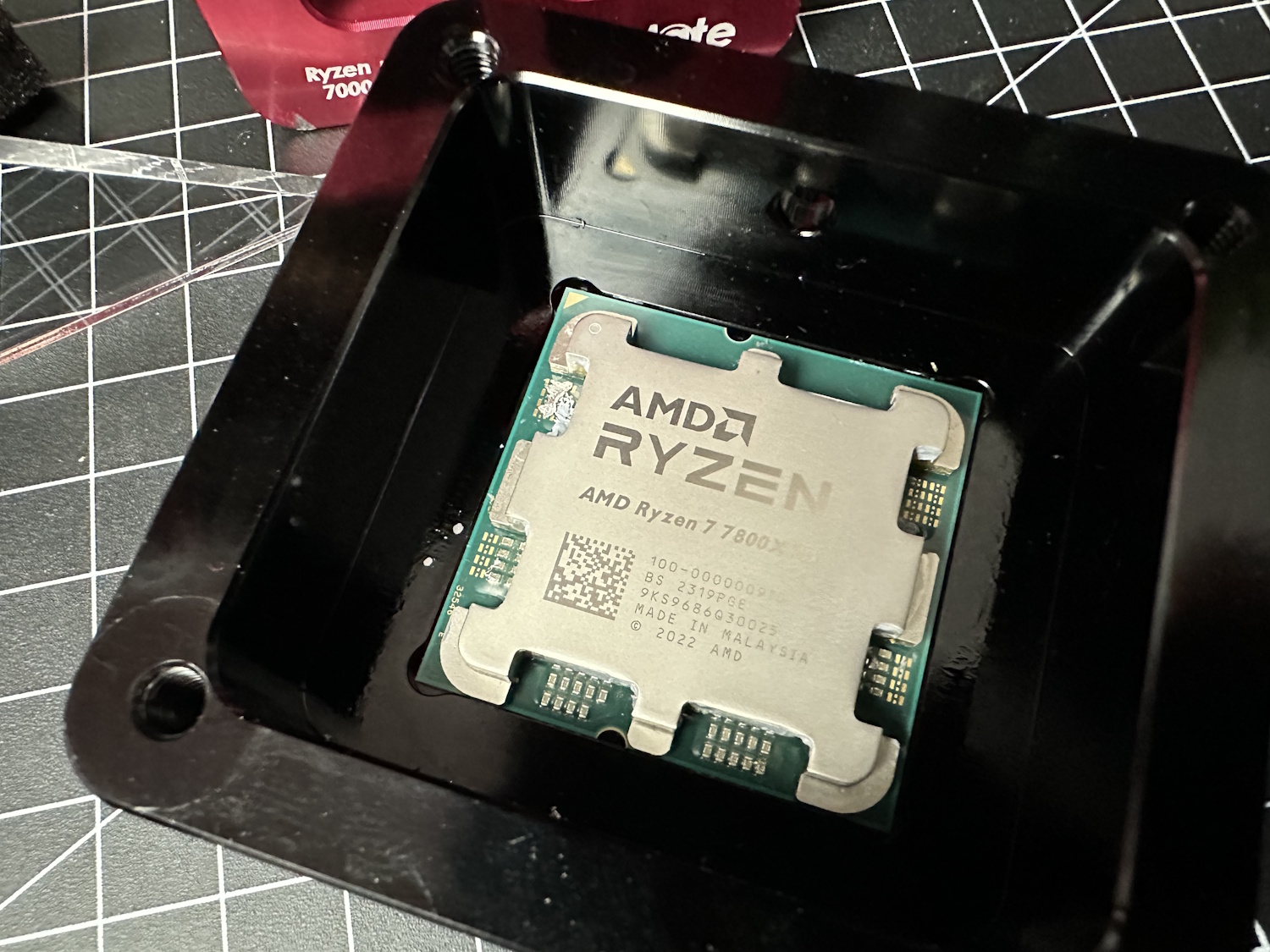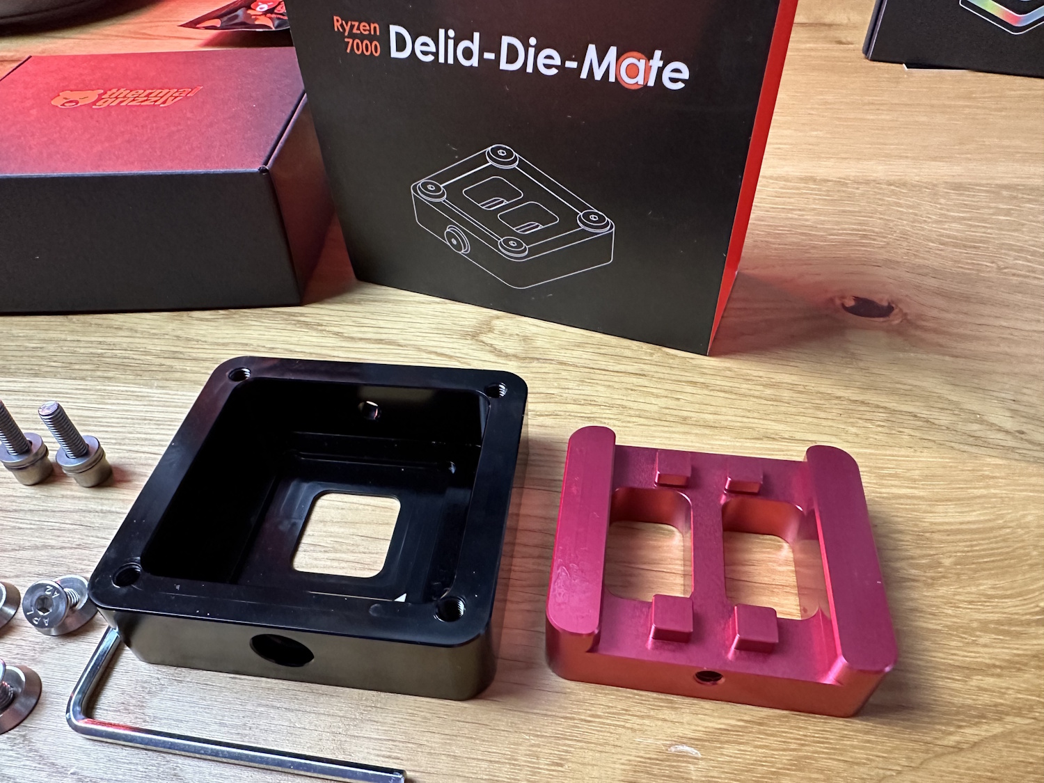 Zuerst alle Schrauben aus dem Delid Die Mate entfernen und den roten Schieber entfernen. Jetzt wird die CPU, dreiecks-Markierung auf Dreieck, in das schwarze Gehäuse eingelegt. Die Platine der CPU wird dabei ohne viel Spiel aufgenommen und quasi formschlüssig festgehalten. Roten Schieber wieder auflegen, er passt nur in einer Position und alle Schrauben wieder montieren. Vier Schrauben auf der Oberseite sorgen zusammen mit Unterlegscheiben, dass der Schieber immer unten gehalten wird.