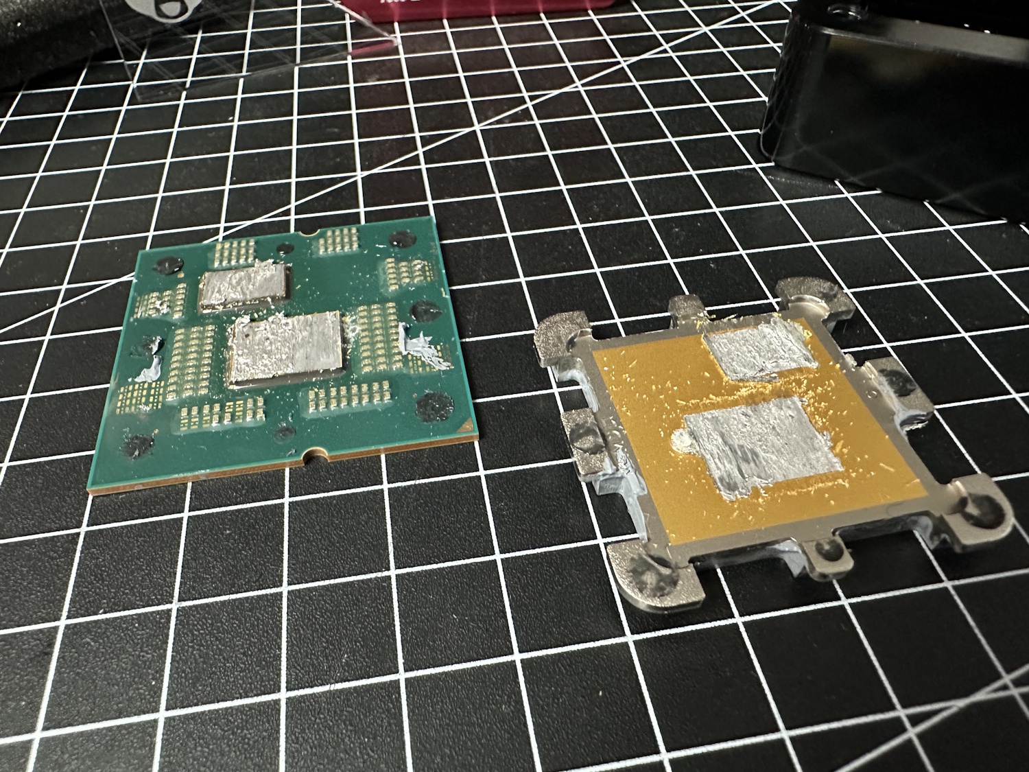 Nachdem mit dem Spachtel das grobe Lot entfernt wurde, war die Spitze bereits etwas stumpf bzw. beschädigt. Auch wenn Silizium an sich ein sehr hartes Material ist, so ist es auch sehr spröde, weswegen drei Gänge Flüssigmetall aufgetragen wurden. Ich war mir letztendlich nicht sicher, wie viel das Silizium wirklich aushält und man möchte unter keinen Umständen die CPU verlieren. Daher weniger kratzen und mehrere Durchgänge Flüssigmetall. Nach je 15 Minuten Einwirkzeit, hat sich das alte Lot immer mehr angelöst und konnte abgewischt werden. Der IHS war bereits beim ersten Durchgang perfekt sauber, aber die Die´s brauchten etwas, um wirklich sauber zu sein. Verfärbungen, die auf dem Chip zurückbleiben sind dabei völlig normal. Wie man auf den Bildern gut erkennen kann, hat AMD bereits ab Werk die SMD Bausteine unter dem IHS mit einem Kleber geschützt.