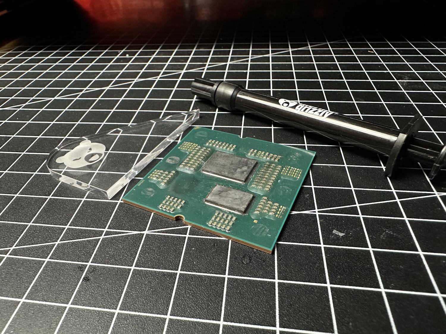 Nachdem die paar Späne abgewischt worden sind und auch der Kleber sehr leicht mit dem beigelegten Kunststoffspachtel entfernt wurde ging es an die Lotreste. An dieser Stelle hätte ich mir etwas mehr Erklärung in der Anleitung oder auf der TG Website gewünscht. Ein Video zeigt zwar den Prozess des Abkratzens und dem Trick Flüssigmetall aufzutragen, um das Indium Lot anzulösen, aber ein paar mehr Vergleichsbilder wären wünschenswert. Auch wenn sich das Köpfen eher an Enthusiasten und erfahrene Nutzer richtet, so fängt jeder irgendwann mal mit einem Thema an.