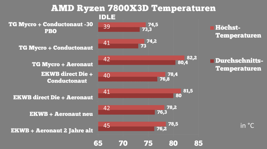 Auch wenn der Direct Die Frame durch seine nur minimal tiefere Einfassung gegenüber dem Die selbst vermutlich ziemlich gut verhindert, dass man das Silizium durch einseitige Spitzenlasten beim Anziehen des CPU Kühlers zerstört, so war es doch jedes mal ein Nervenakt den EKWB Kühler zu verbauen, gerade mit der wilden Montagesituation, die Aufgrund der tieferen Montage – dank fehlendem Heatspreader, gewählt werden musste. Der Anpressdruck war trotzdem für die Tests ausreichend, zeigt aber durch die kleine Chipfläche und die konzentrierte Wärmeeinbringung, dass ein normaler Wasserkühler vielleicht doch schnell überfordert wird. Die Temperaturen steigen im EKWB Direct Die um 3°C in der Spitze. Der Vergleich mit Aeronaut hingt vielleicht etwas, da vermutlich sich niemand die Mühe des Köpfens macht und dann eine „Einsteiger“ Wärmeleitpaste verwendet, aber diese hatten wir gerade zur Hand und dient lediglich als Vergleich. Dennoch sieht man, dass auch der TG Mycro Direct Die Wasserkühler mit Aeronaut nicht sein volles Potential ausschöpfen kann. Mycro mit Aeronaut montiert stellt dabei sogar den worse case dar und zeigt die schlechtesten Temperaturen des gesamten Feldes. Während der EKWB Kühler auf dem geköpften 7800X3D mit Flüssigmetall unter Last gerade so auf die Temperaturen der Eingangsmessung kommt, so sind die Leerlauftemperaturen immerhin um 5°C niedriger. Der Vollständigkeit nochmal die weiteren, erhobenen Werte: