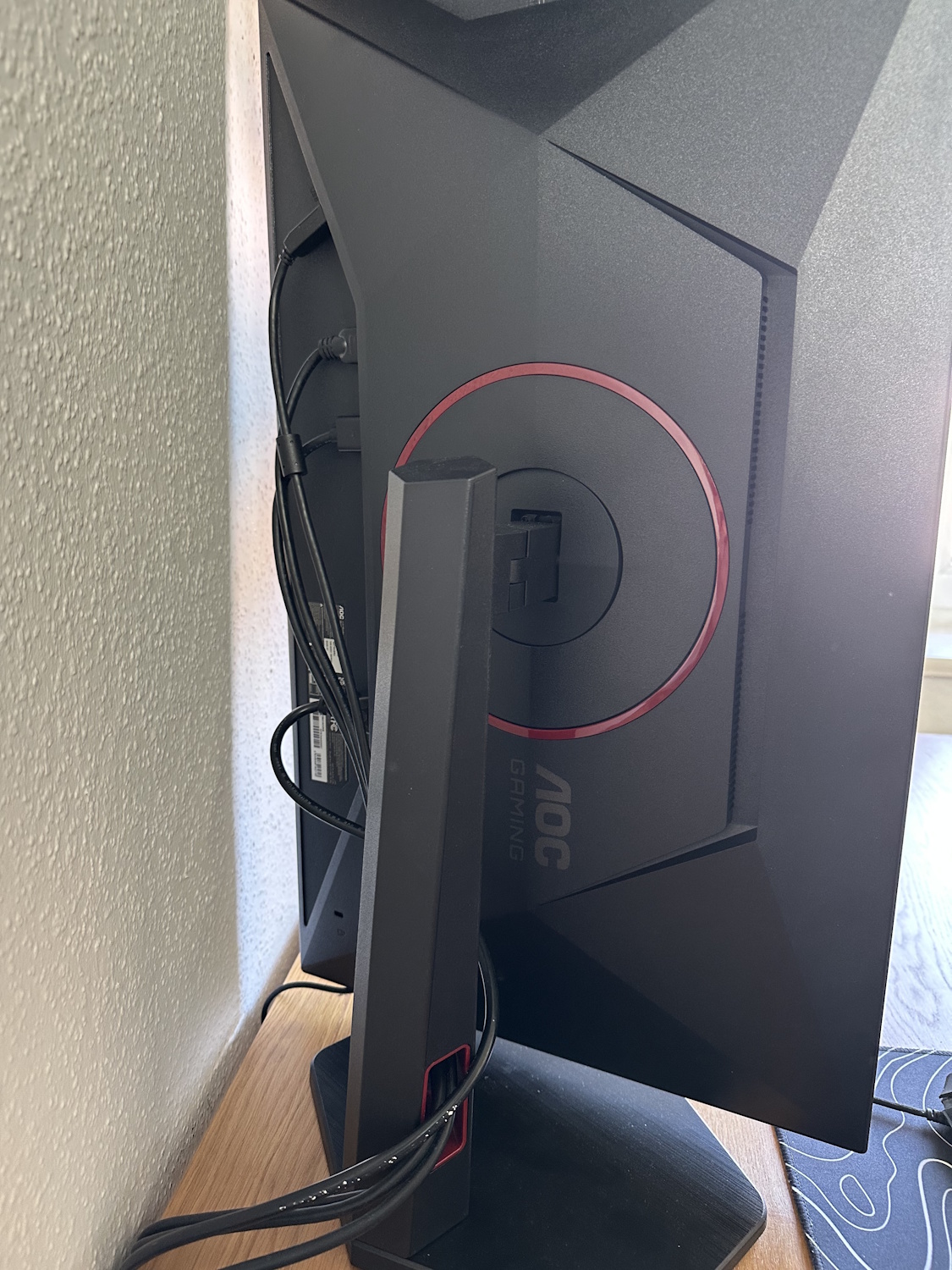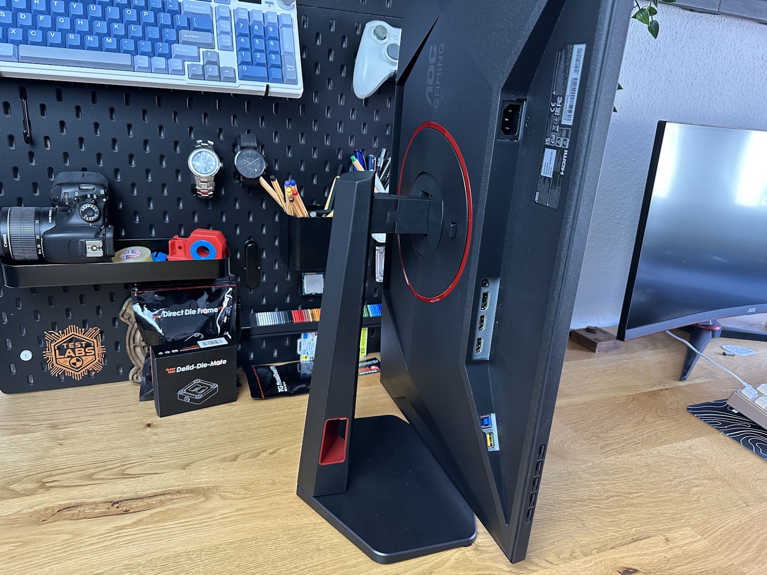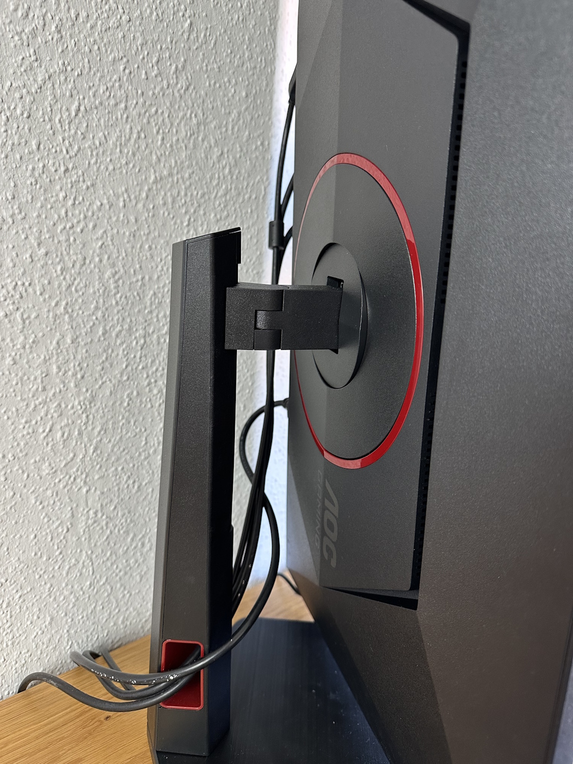Der Fuß ist dabei in Zusammenarbeit mit E Sportlern designed worden und ragt durch die Hexagon Form nicht so weit vom Bildschirm hervor wie andere AOC Standfüße. Auf einem normalen Schreibtisch wird dies vermutlich keinen Unterschied machen. Aber scheinbar sitzen E Sportler deutlich näher am Monitor und haben ihre Peripherie im Winkel zum Monitor angeordnet.