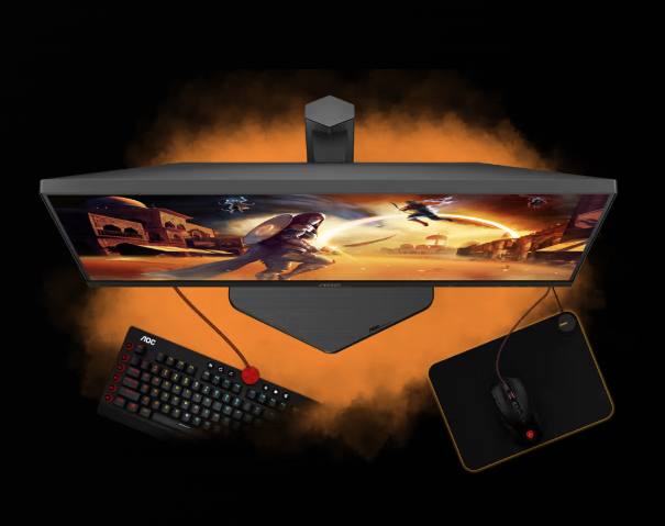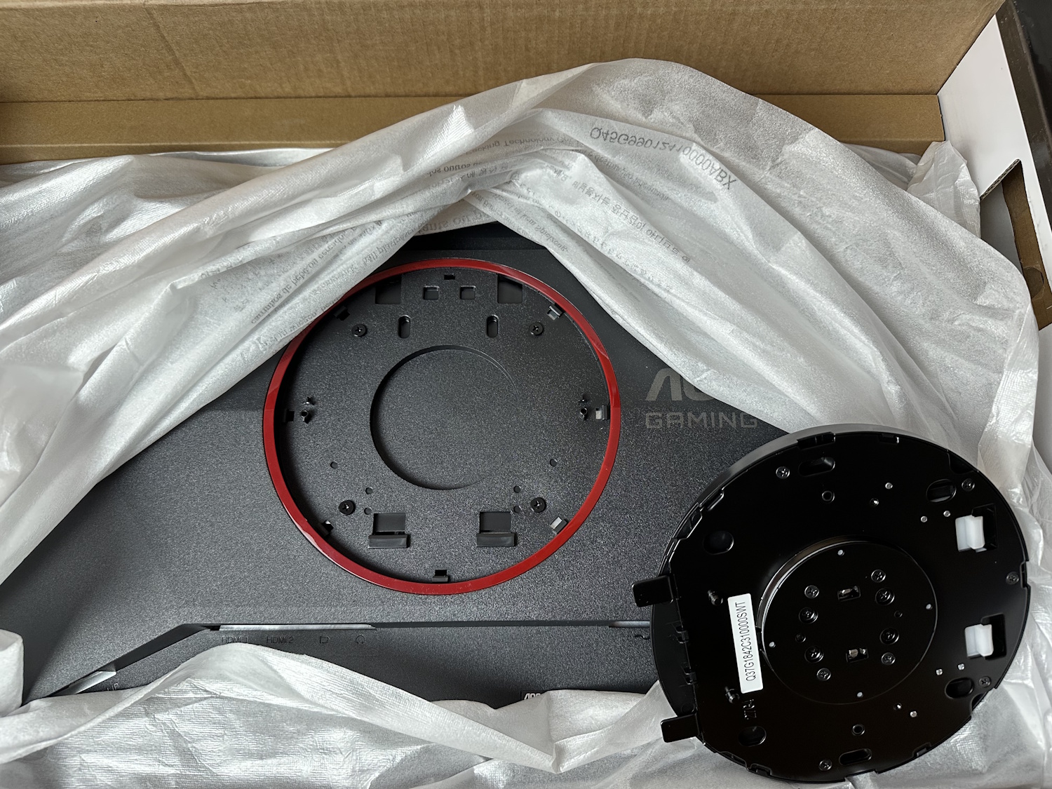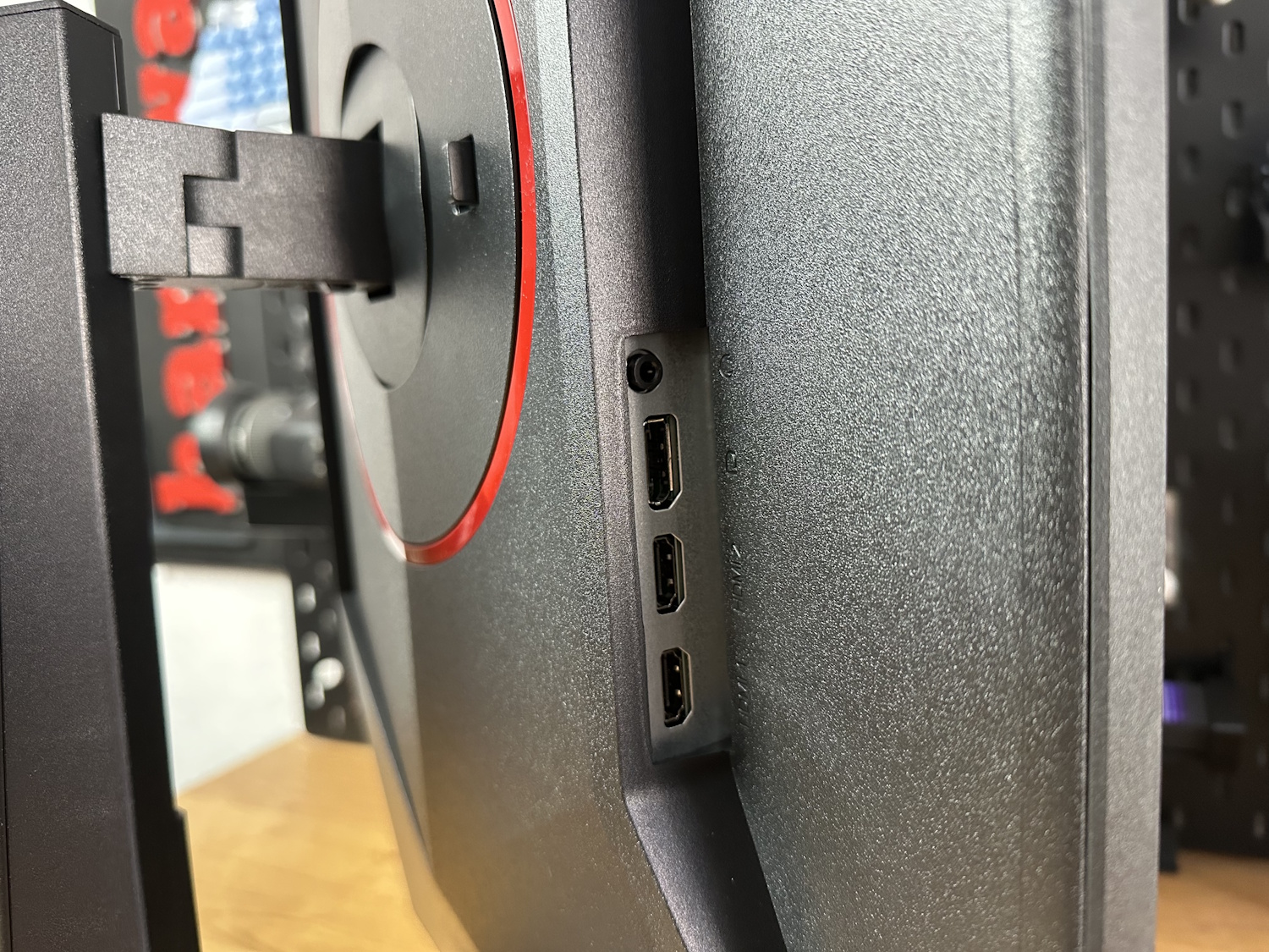 Der Fuß ist dabei in Zusammenarbeit mit E Sportlern designed worden und ragt durch die Hexagon Form nicht so weit vom Bildschirm hervor wie andere AOC Standfüße. Auf einem normalen Schreibtisch wird dies vermutlich keinen Unterschied machen. Aber scheinbar sitzen E Sportler deutlich näher am Monitor und haben ihre Peripherie im Winkel zum Monitor angeordnet.