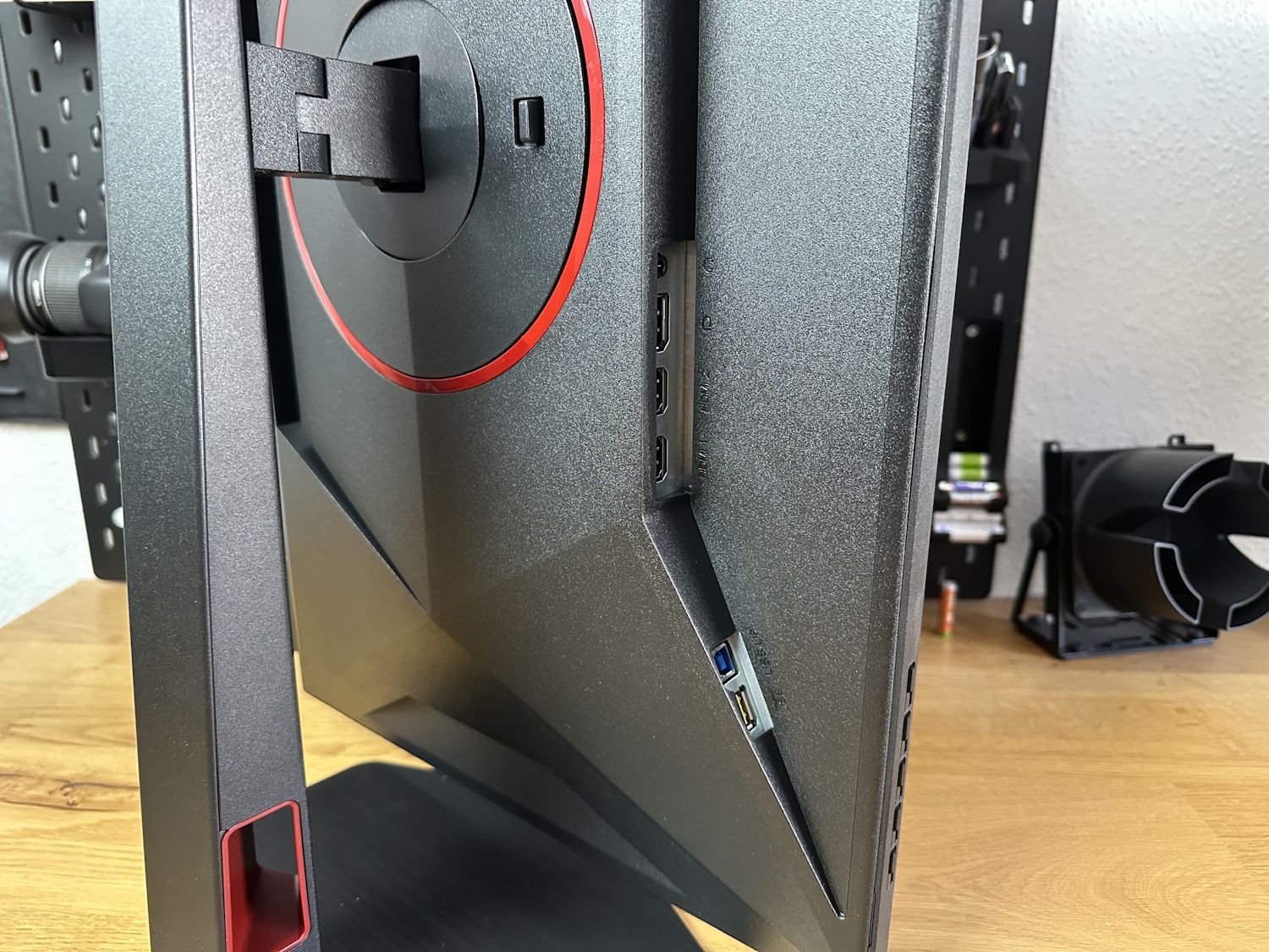 Neben einem DisplayPort 1.4, bietet der Q27G4SRU zwei HDMI 2.1 Anschlüsse, einen USB 3.2 Gen1 Hub (5 Gbit/s), der mittels B Buchse versorgt wird und drei seitliche Ausgänge besitzt, zusätzlich einen extra USB Port unten mit Schnellladefunktion. Das Netzteil ist intern verbaut, sodass die Stromversorgung lediglich mit einem klassischen Kaltgeräte Kabel erfolgt. Oberhalb des Displayports befindet sich noch ein 3,5 mm Klinkenanschluss für Tonausgabe an Kopfhörer. Der Q27G4SRU hat allerdings auch zwei je 2 W Lautsprecher verbaut. Diese sind aber eher als Nice to have anzusehen, denn die Qualität der Audioausgabe reicht für Windows Sounds, das gelegentliche Youtube Video und Radio, aber wirklich drauf gamen oder einen Film schauen möchte man nicht. Eine Buchse für ein Kensington Lock ist ebenfalls rückseitig vorhanden.