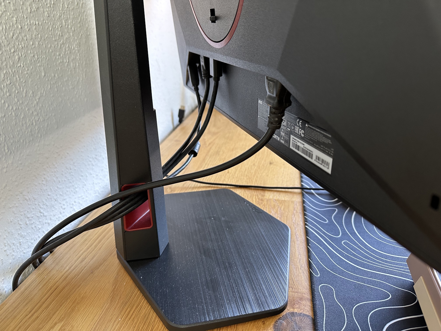 Die Materialien gliedern sich nahtlos in die anderen AOC Gaming Produkte ein. Hauptsächlich schwarzer Kunststoff der mit einer rauen Textur versehen ist sowie rote Akzente. Wenn auch die roten Highlights bei diesem Modell eher auf der Rückseite und bei der Kabeldurchführung zu finden sind. Die beim CU34G2XP/BK auf der Vorderseite befindliche rote Leiste, finden wir am Q27G4SRU nicht.