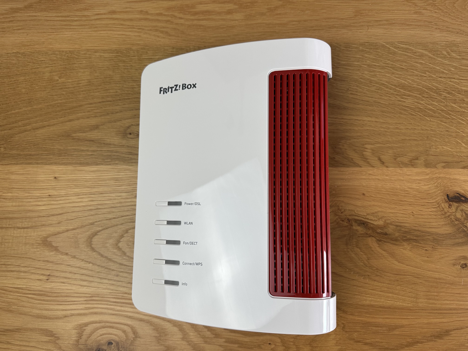 Auf der Oberseite befinden sich Status-LEDs für Power/DSL, WLAN, Fon/DECT, Connect/WPS und Info. Wobei die mittleren drei Anzeigen WLAN, Fon/DECT und Connect/WPS noch je einen Knopf integriert haben. Auf der Router Weboberfläche lassen sich die LEDs in Helligkeit und bei der Info LED auch für verschiedene Funktionen belegen und einstellen. Der rote Bereich ist perforiert und erlaubt Luftzirkulation.