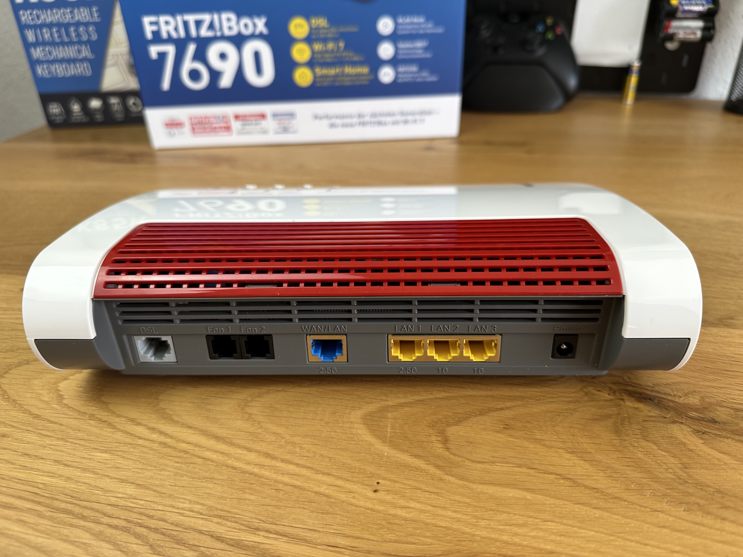 | Anschlüsse | 1 x (V)DSL bis 300 MBit/s und ADSL2+, 1 x 2,5-Gigabit-WAN/LAN Kombo, 1 x 2,5-Gigabit-LAN, 2 x Gigabit-LAN, 2x Anschlüsse für analoge Telefone, Anrufbeantworter oder Fax (2x RJ11, 1x wahlweise TAE), 1 x USB 2.0 für Speicher und Drucker, + Zigbee Basis, + DECT Basis |