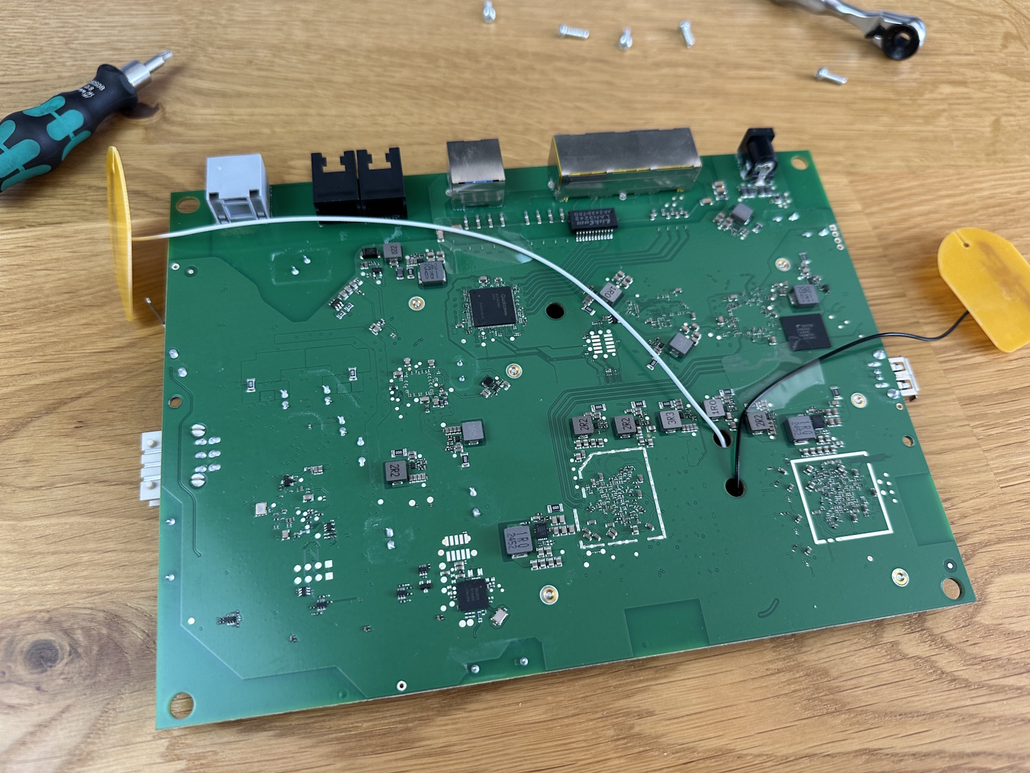 Vielleicht weniger Komponenten als man vielleicht erwarten würde. Man kann gut die Antennen erkennen, wenn auch viel durch das Hitzeschutzblech bzw. den Kühlkörper abgedeckt wird. Die FRITZ!Box 7690 unterstützt 4 x 4 MIMO, also das Senden via vier Antennen und das gleichzeitige Empfangen über vier Antennen. Dabei wird dies auch bei mehreren Nutzern erlaub sowie jetzt neu unter Wi-Fi 7 mit verschiedenen Frequenzen gleichzeitig. Die FRITZ!Box 7690 kann sich also gleichzeitig mit dem selben Endgerät per 2,4 GHz und 5 GHz verbinden und die Datenrate weiter steigern. Es lassen sich ein Qualcomm Netzwerkchip sowie ein Dialog DECT Controller erkennen, neben Standard Bauteilen wie Spulen (mit Aufdruck 1R0, 2R2) zur Spannungsreglung und Kondensatoren die etwaige Spannungsspitzen ausgleichen oder glätten bzw. speichern.