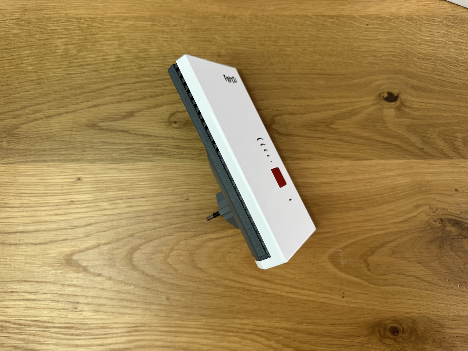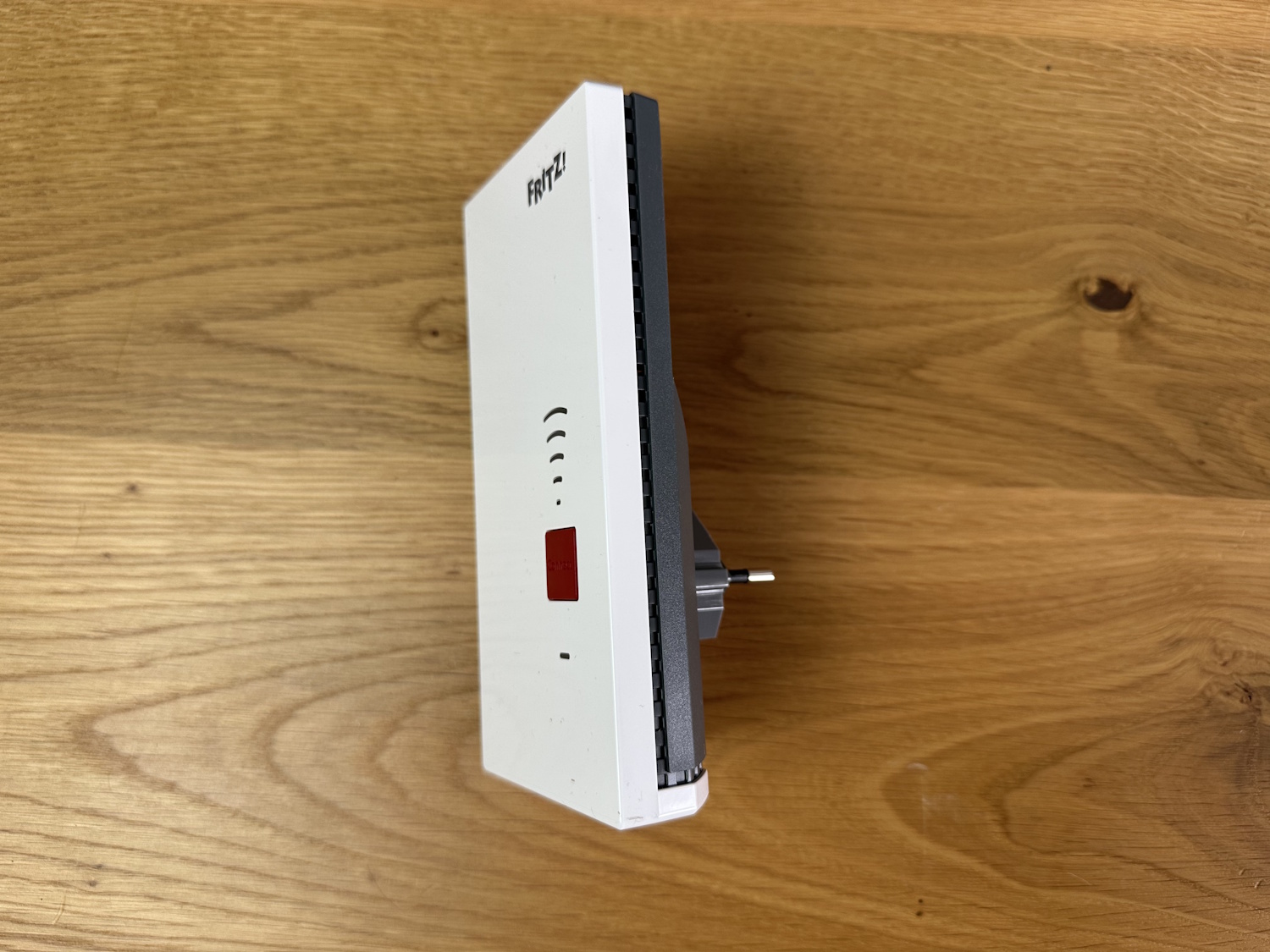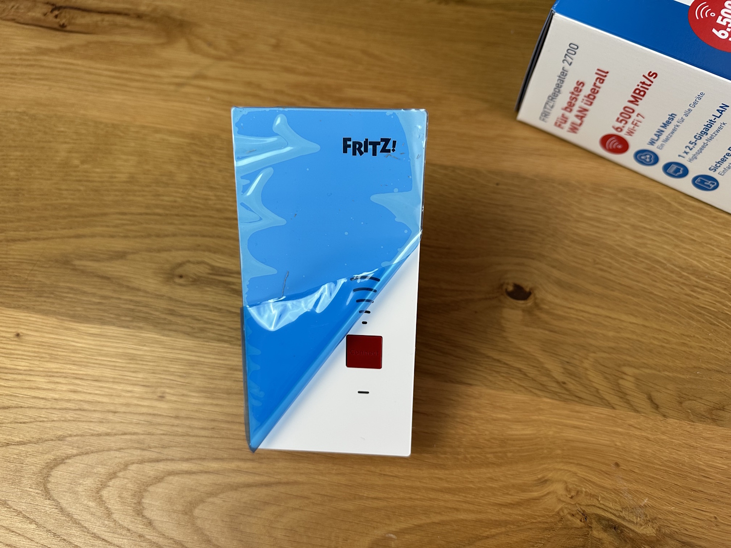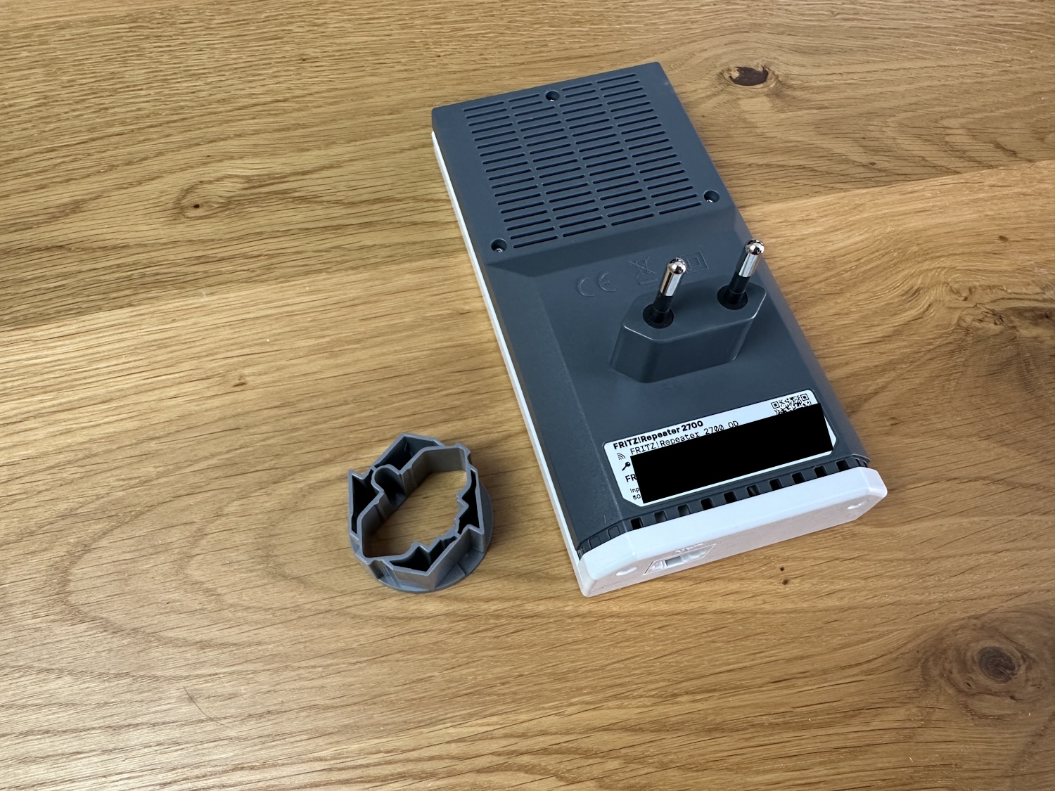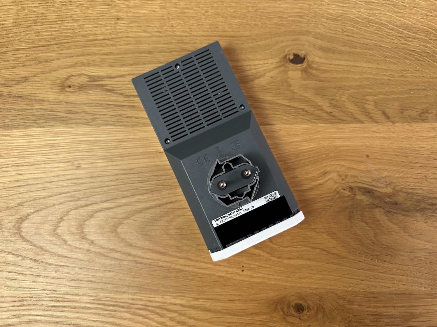 Auf dem Typenschild befindet sich das ab Werk vergebene Passwort für die Weboberfläche und der abziehbare Stabilisator für die Steckdose. Ein nettes Gimmick, wie auch schon beim Smart Gateway, allerdings werden vermutlich die wenigstens Nutzer ständig am Repeater herum reißen, um die erhöhte Stabilität auch zu merken. Entfernt passt der FRITZ!Repeater 2700 so auch in Eurosteckdosen Typ C. Durch die Abmessungen braucht man sich aber nicht denken, dass der Repeater dadurch besser auf Mehrfachsteckdosen funktioniert, die nächstgelegenen Buchsen werden trotzdem überlagert.