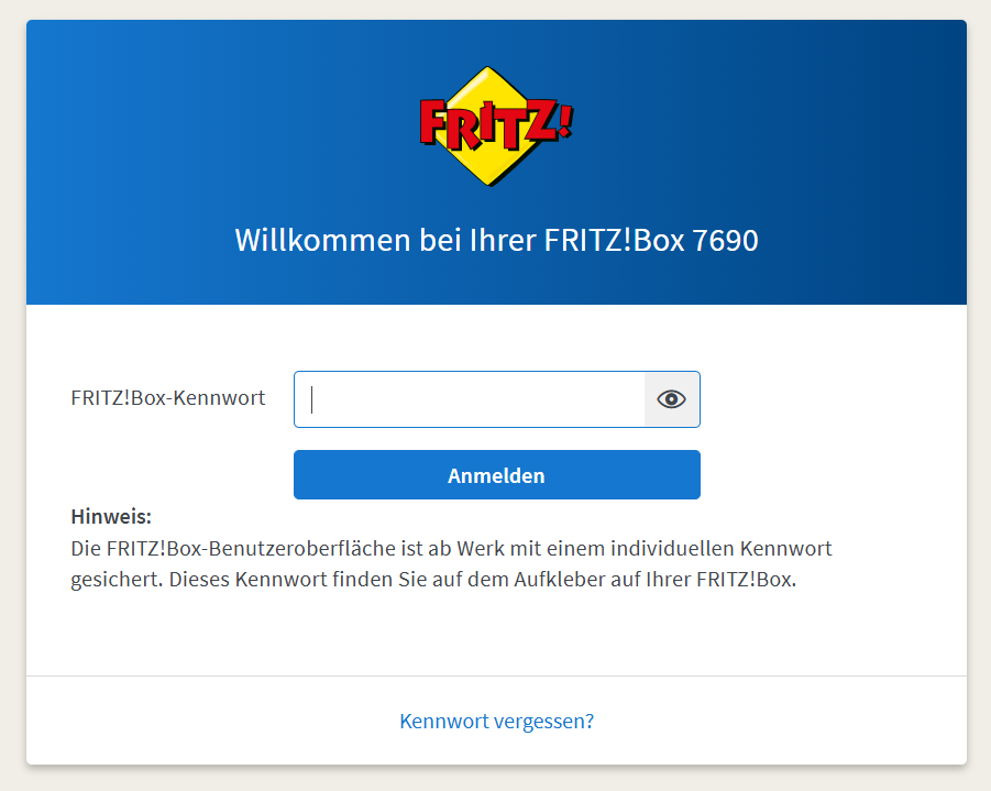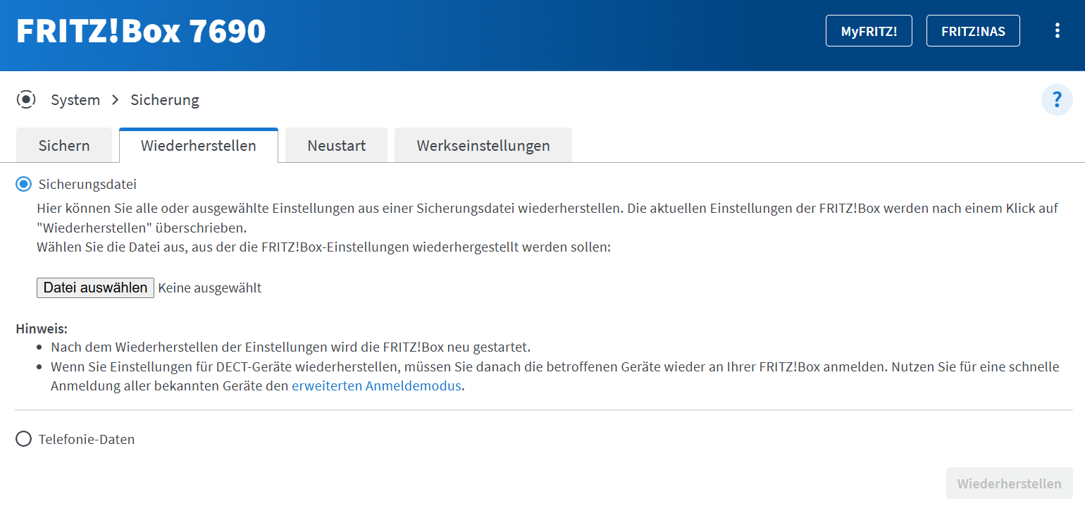 Für den Import wird nach Eingabe des von FRITZ! vergebenen Passworts, welches sich auf der Rückseite der FRITZ!Box befindet, im Einrichtungs-Assistenten auf „Einstellungen übernehmen“ geklickt. Der Assistent beendet sich und man befindet sich auf der „Sicherung wiederherstellen“-Seite der 7690. Ähnlich wie bei der alten 7490, wo wir über die „Sichern“ Seite die genau jetzt zu importierende Datei erstellt haben.