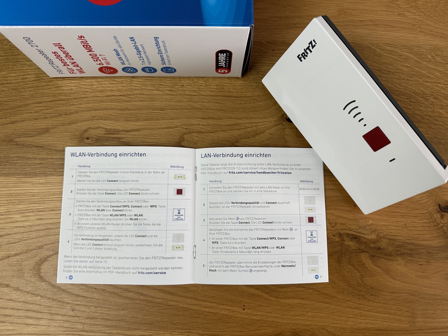 Sobald auch hier die Empfangsbalken leuchten, ist die Einrichtung abgeschlossen und es muss noch das WLAN Mesh aktiviert werden. Dazu einmal kurz auf die Connect Taste des Repeaters, die Status LED blinkt schnell, im Anschluss die Connect Taste des 7690 Routers drücken und die Mesh Daten und Einstellungen werden aus dem Router übernommen. In der FRITZ!Box Weboberfläche wird dies entsprechend angezeigt. Hier via 1 Gbit/s LAN, da nicht direkt an einen 2,5 Gbit/s Port der 7690 angeschlossen, obwohl der FRITZ!Repeater ebenfalls einen 2,5 Gbit/s Port besitzt. Im Beispiel Haus läuft vom Router erstmal ein CAT 7 Kabel komplett auf die andere Seite des Hauses in einen D-Link DGS 1210-20 smart managed Switch und wird von dort aus weiter verteilt. Erst die größeren und deutlich teureren FRITZ!Repeater der 3000 oder 6000 Serie bieten zwei LAN Anschlüsse und könnten das kabelgebundene Signal auch weitergeben. Demnächst wird es auch mit dem FRITZ!Repeater 6700 Pro, einen Wi-Fi 7 Ableger mit 6 GHz und 10 GBit/s LAN sowie 2,5 GBit/s LAN zu einem entsprechenden High End Preis geben. Dabei sollen kombinierte Datenraten von bis zu 18 GBit/s erreicht werden können. Für uns jetzt aber erstmal Zukunftsmusik, da weder Veröffentlichtungsdatum noch Preis bekannt sind.