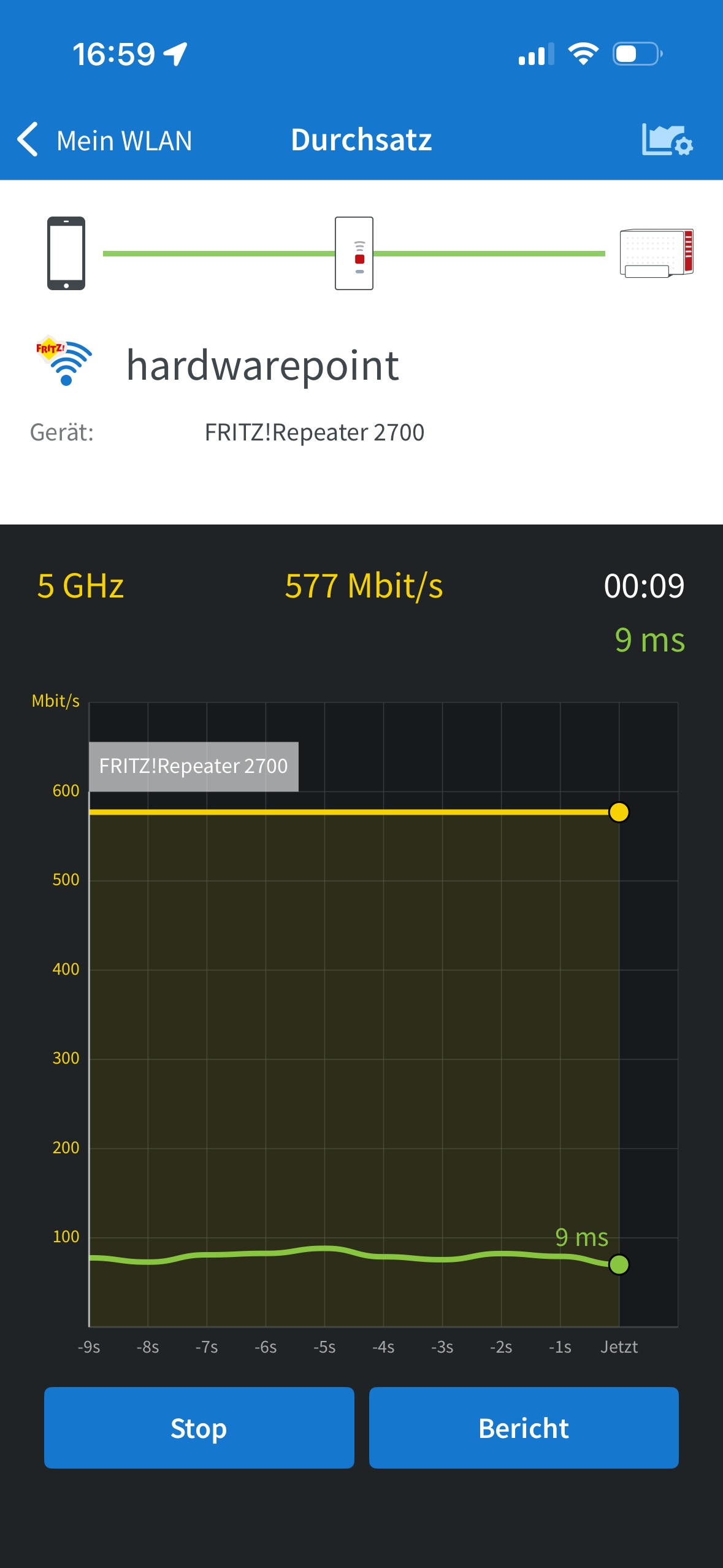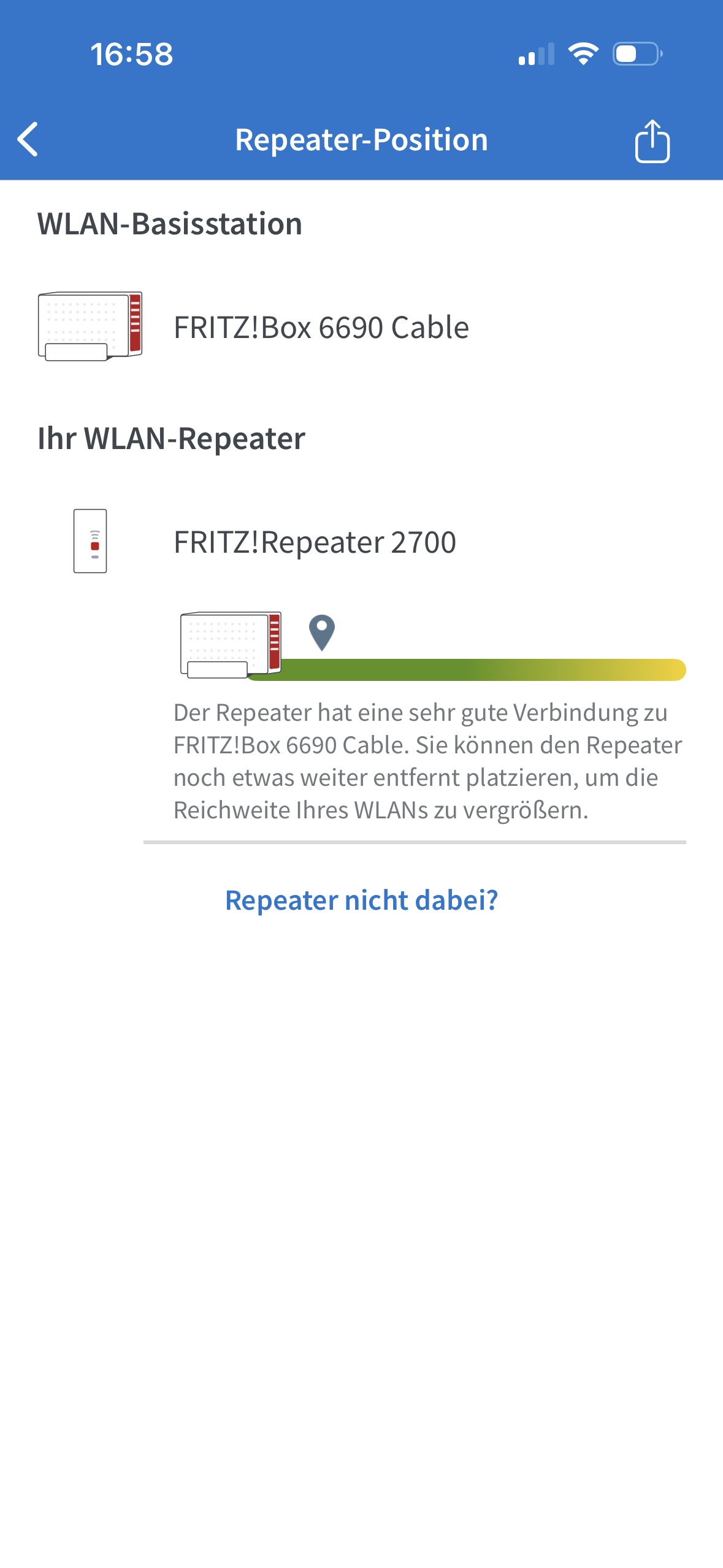 Jetzt kann der Repeater an entsprechender Position angesteckt werden, greift das eingehende Signal via LAN auf und verbreitet in seinem Umfeld das WLAN, wie auch vom Router selbst. Das kleine, blaue Symbol mit den drei verbundenen Kreisen zeigt die aktive Mesh Funktion. Die Hilfestellung für den perfekten Aufstellungsort, wie sie per FRITZ!WLAN App angeboten wird, lassen sich per LAN Brücke nicht verwenden, da man ja bereits eine optimale Verbindung zum Router hat. Die App hilft aber bei den WLAN Brücken, da hier ein guter Kompromiss zur Router Entfernung und Reichweitenerhöhung mittels Repeater geschaffen werden kann. (Im Beispiel auf einem iPhone 14 Pro ausgeführt, Wi-Fi 6 2×2)