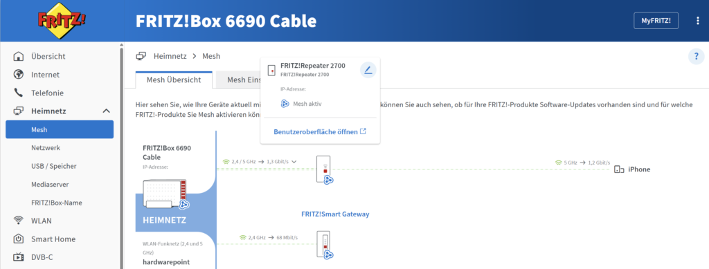Dies funktionierte bei uns mit einer FRITZ!Box 6690 tadellos, im späteren Einsatz in unserem Beispielhaus kommt allerdings eine LAN Brücke zum Einsatz.