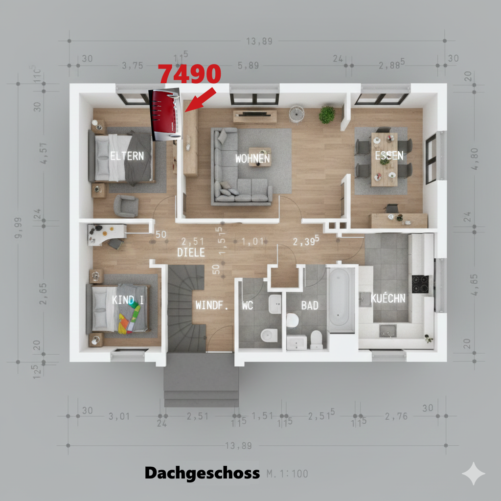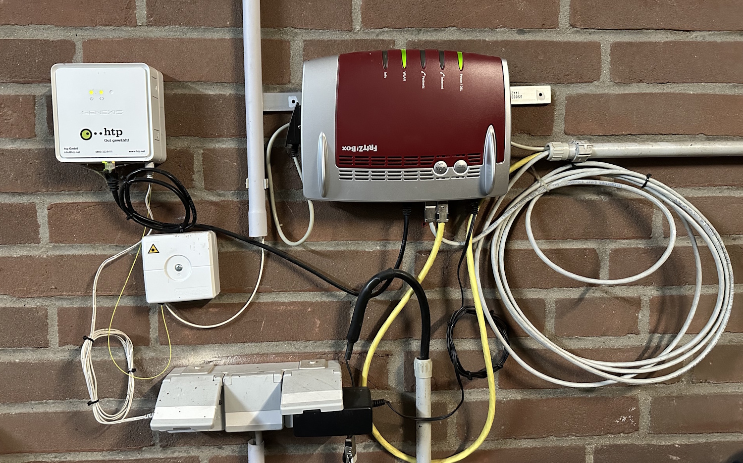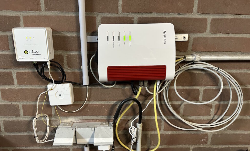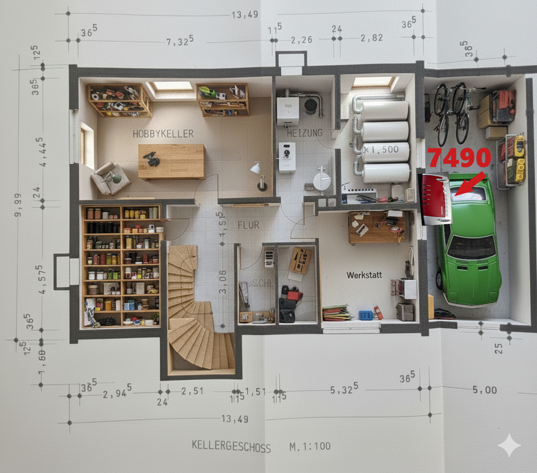 Ausgangslage ist das Meshnetzwerk der FRITZ!Box 7490. Wi-Fi 5 bzw. WLAN AC. Die Hauptzentrale befindet sich in der Garage, dort ist der Glasfaseranschluss und die erste 7490 montiert: