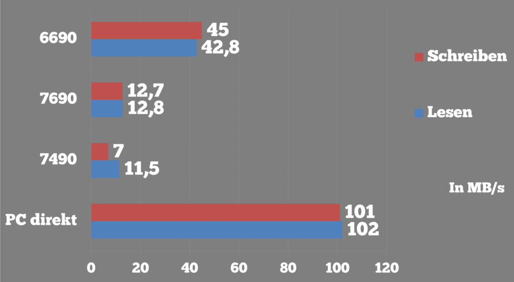 Die theoretische, maximale Geschwindigkeit von USB 2.0 mit 60 MB/s, lässt sich in der Realität nicht erreichen. Die Baseline haben wir mit einer externen Festplatte am PC erstellt. Dabei wurden die ca. 100 MB/s an einem USB 3.0 Anschluss erreicht, bei USB 2.0 sinkt die Rate auf 37MB/s. Die 6690 profitiert also ganz klar durch die USB 3.0 Konnektivität. Im Umkehrschluss wird die 7690, die vermutlich mit einem entsprechend neueren USB 3.0 Anschluss auf ähnliche Datenraten gekommen wäre, deutlich ausgebremst. Der interne Speicher ist ebenfalls halbiert (6690 Cable als Vergleich), wenn auch bei beiden die Größe des Speichers als homöopathisch einzustufen ist. Außer Kleinkrams lässt sich mit der Menge kein wirklicher NAS Betrieb gewährleisten. Kommend von der 7490 also ein kleines Upgrade, aber Meilenweit zurückgefallen, wenn man die Brücke zur 6690 schließt.
