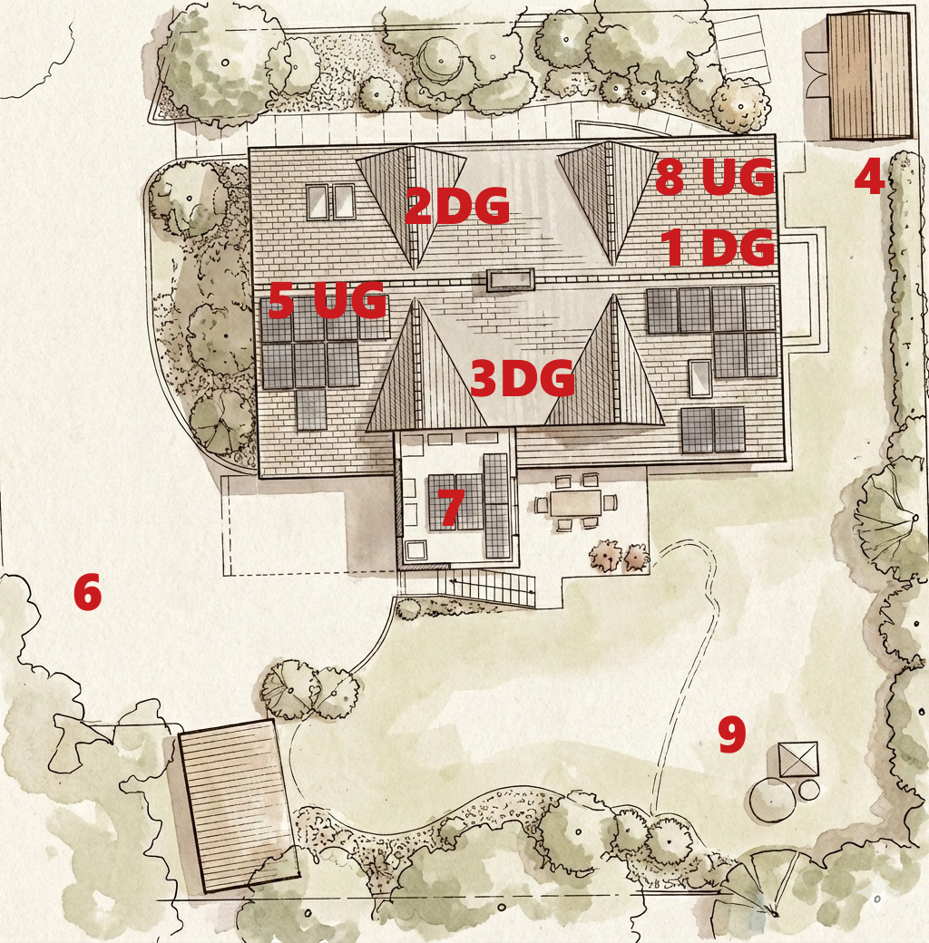 Das nachfolgende Bild zeigt das Grundstück und die verschiedenen Messpunkte. UG steht dabei für eine Messung im Keller, DG für Dachgeschoss und bei Zahlen ohne Zusatz, bedeutet eine Messung draußen im Garten. Die 7 ist dabei auf dem Balkon, der an das Dachgeschoss angebaut ist.