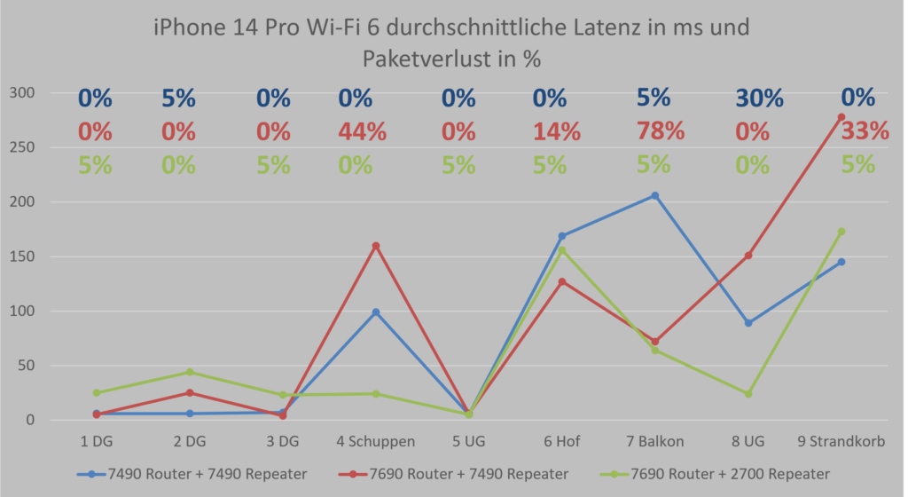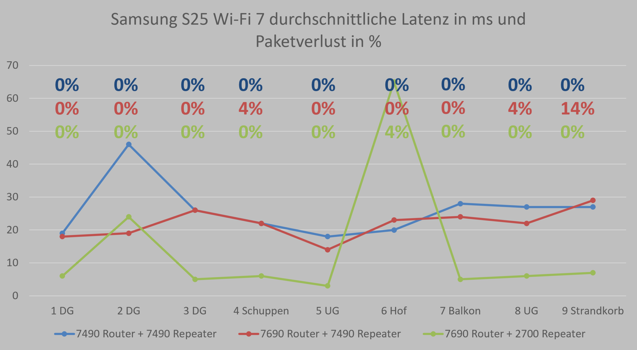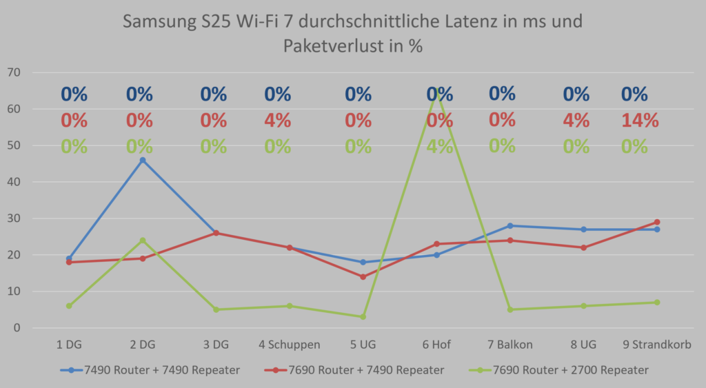 Auffällig ist zudem, dass nicht der maximale Durchsatz, sondern vor allem Latenz und Paketverlust die Nutzererfahrung bestimmen. In Randbereichen wie Balkon oder Garten kommt es teils zu drastischen Einbrüchen, die sich im Alltag deutlich bemerkbar machen. Dabei hängt es stark vom Mesh Steering ab, welcher Zugangspunkt und welches Netz wird für das Endgerät ausgehandelt. Teils zeigen die Diagramme nicht optimale Verbindungen, sodass der vermeintlich stärkere Router dann doch mal das Nachsehen in Durchsatz oder Latenz zum Endgerät aufweist.