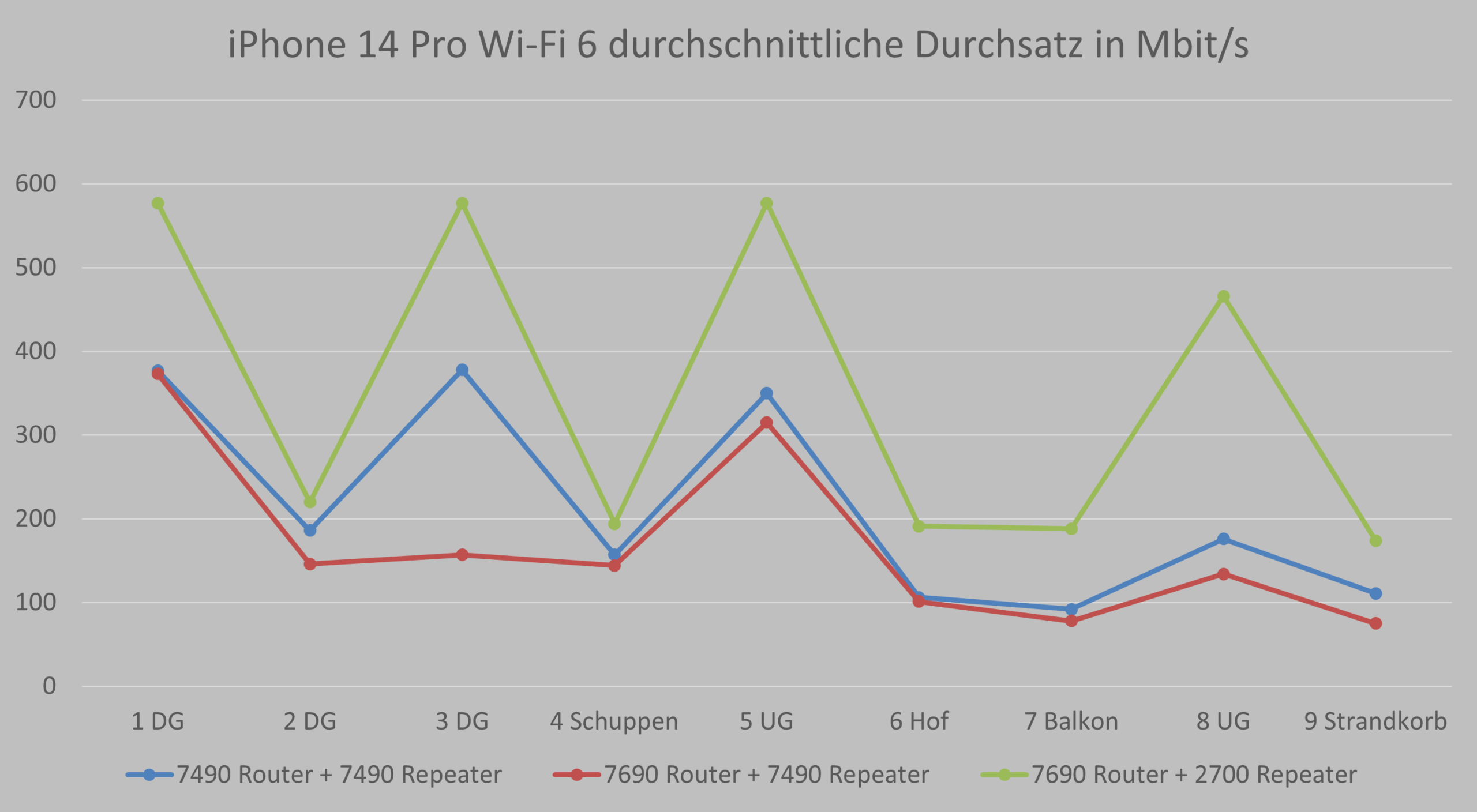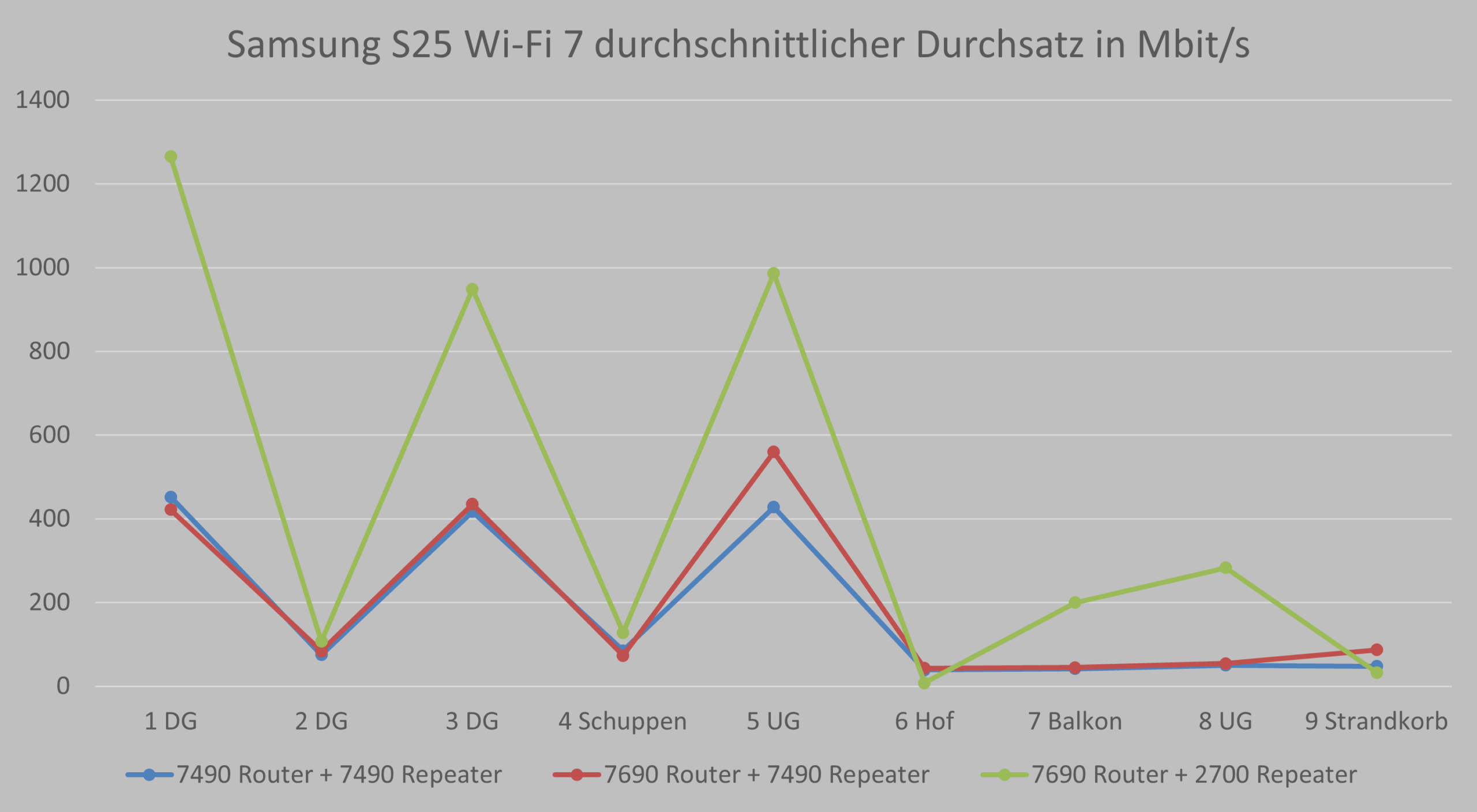 In einer dritten Runde wurde die zum Repeater umfunktionierte FRITZ!Box 7490 durch den FRITZ!Repeater 2700 ausgetauscht um ein komplettes Wi-Fi 7 Mesh aufzuspannen. Als Endgerät kamen für alle Tests ein iPhone 14 Pro (WLAN 6 (802.11ax) mit 2×2 MIMO) zum Einsatz und ein Samsung S25 (WLAN 7 (802.11be) mit MIMO) um auch volles Wi-Fi 7 mit MLO, also der Kombination aus gleichzeitigem 2,4 GHz und 5 GHz Band zu erlauben.